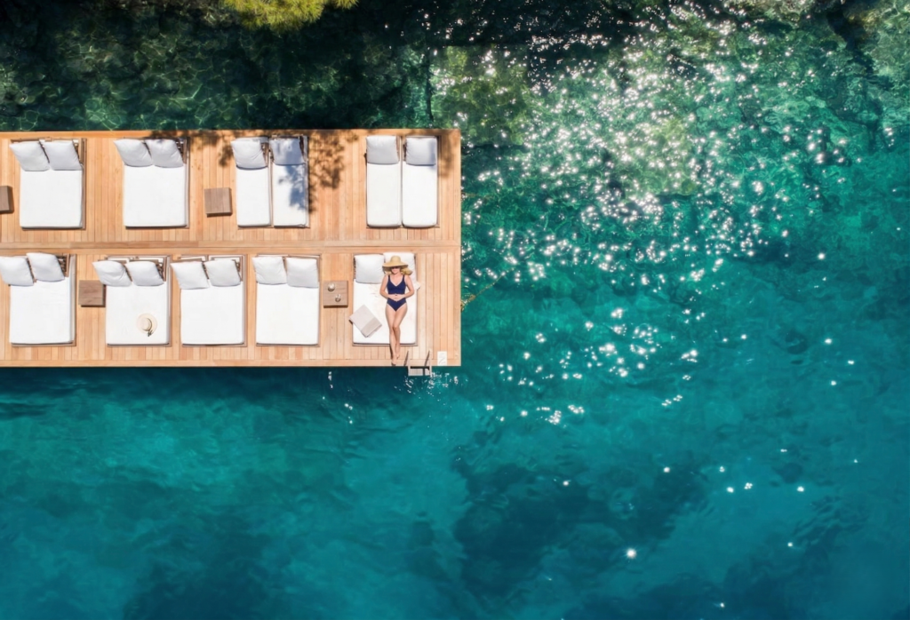 Stel je even voor: je wordt langzaam wakker, rekt je uit in een heerlijk zacht bed en het eerste wat je hoort is het zachte kabbelen van de golven en het rustgevende gezang van krekels. Je opent de schuifdeuren van je kamer, ademt de zilte zeelucht in vermengd met de geur van pijnbomen, en kijkt uit over een kristalheldere, azuurblauwe zee.